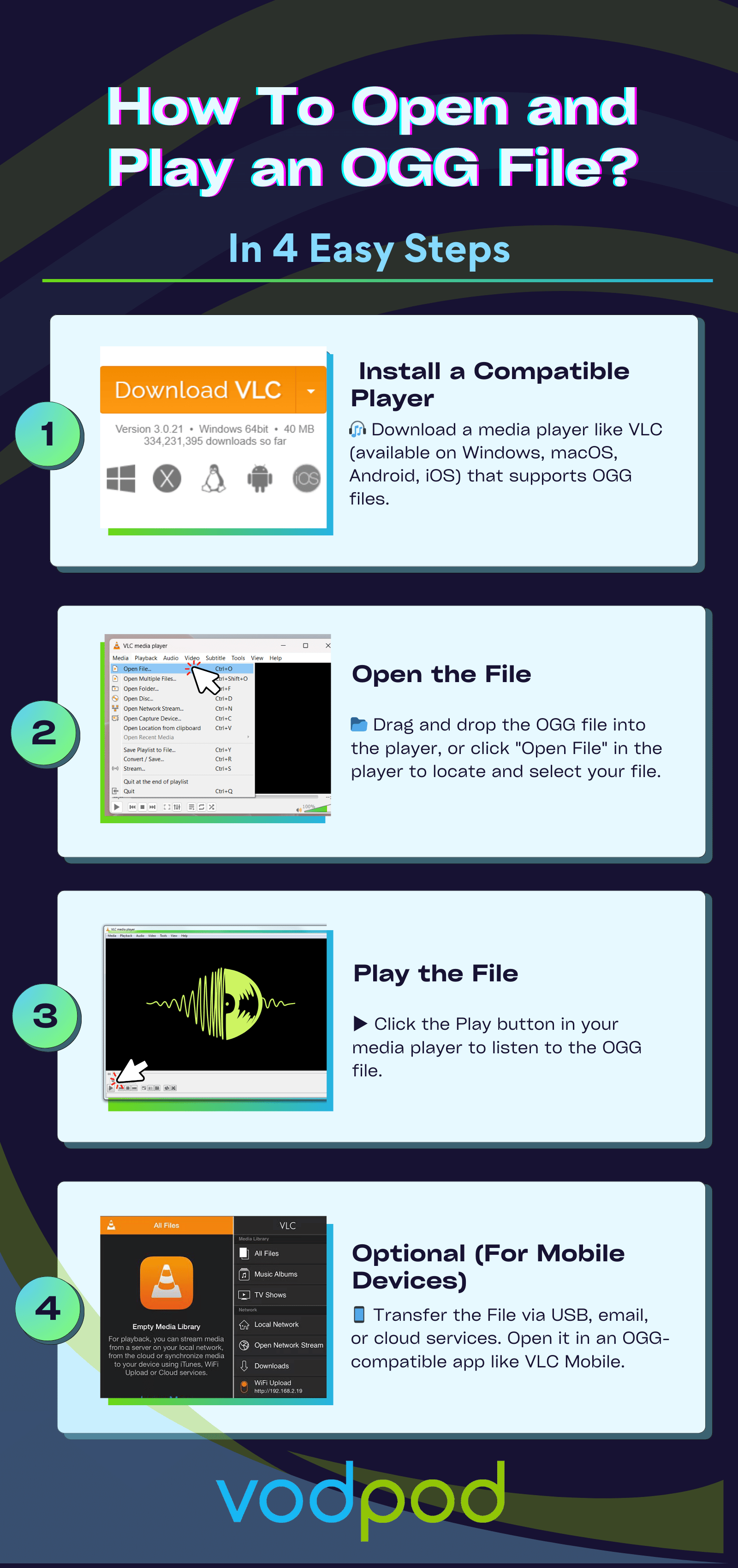 - Alternatively, open the VLC Media Player and click ‘File’ in the menu bar at the top of the screen. Select ‘Open File’ from the dropdown menu. Navigate to the location of your OGG file, select it, and click ‘Open.’
