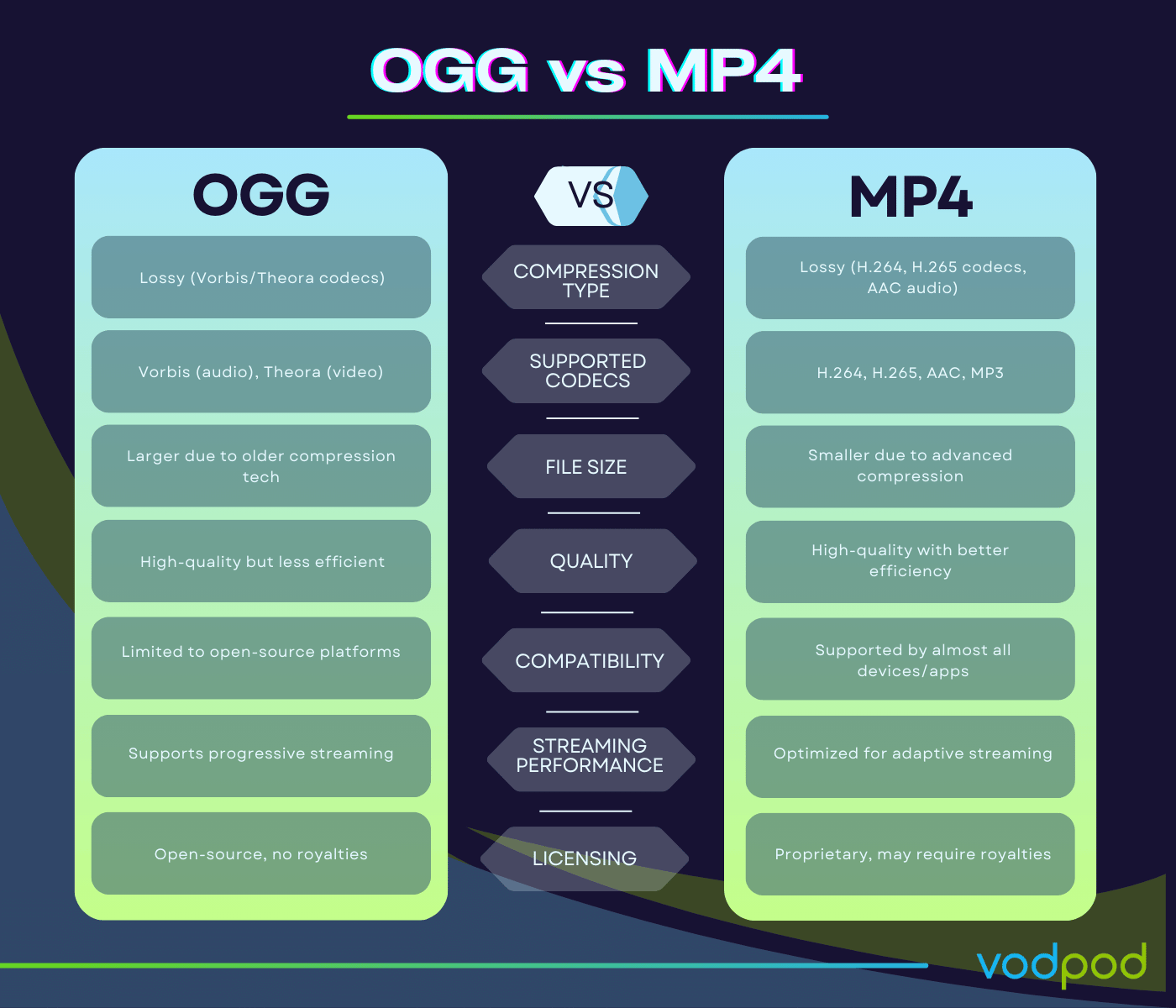 Conclusively, OGG offers a compelling option for high-quality audio and open-source video projects, particularly appealing for its royalty-free licensing. In contrast, the broad device compatibility and superior compression efficiency of MPEG standards are better suited for high-definition video content and applications requiring widespread platform support.