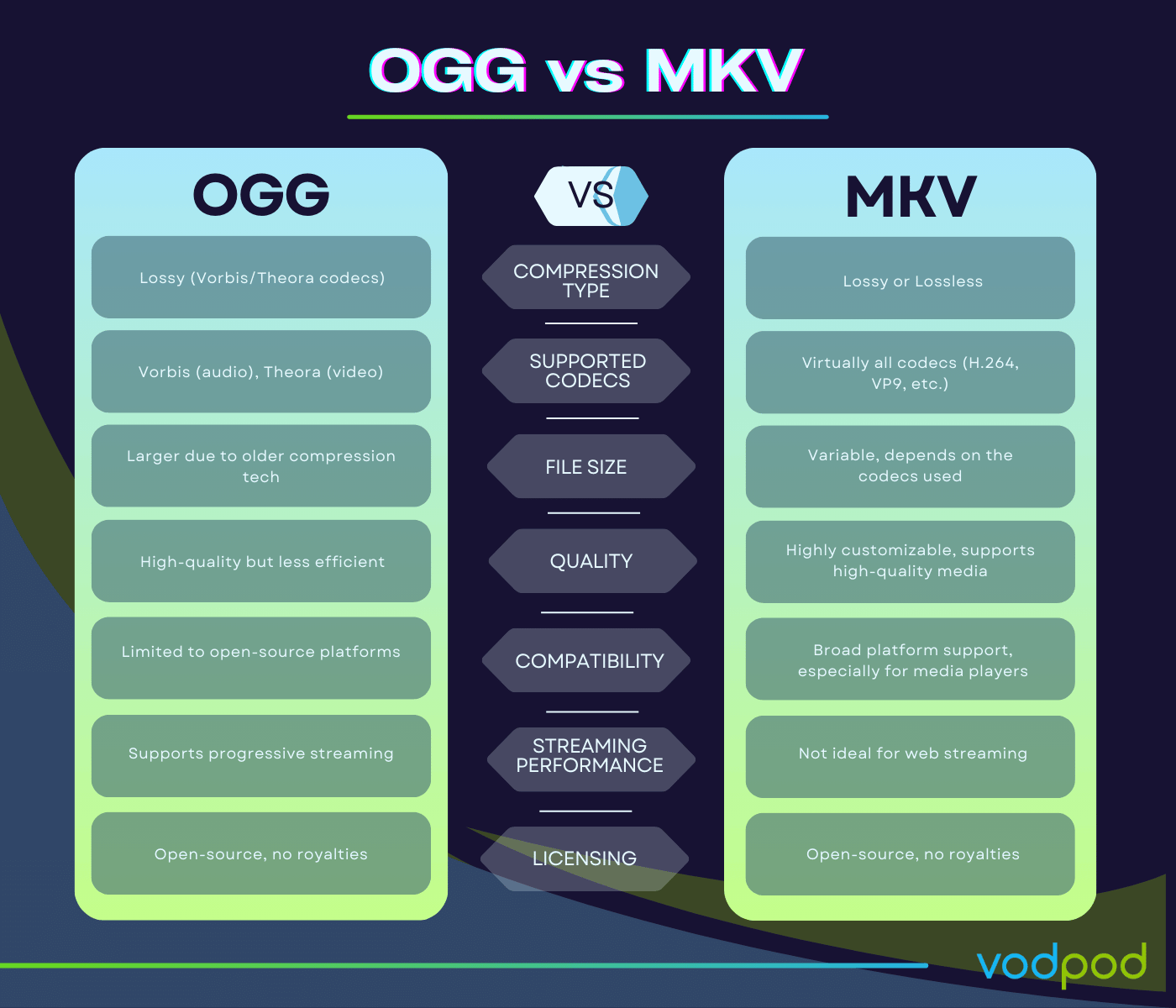 Consequently, the advancement in compression techniques allows MKV videos to balance quality and file size. OGG/OGV uses older and less efficient codecs like Theora and Vorbis. As a result, these high-efficiency codecs ensure that MKV videos have relatively smaller file sizes than OGG/OGV files at similar quality levels.